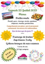 Menu: Paëlla mixte ( Poulet, porc, chorizo, merlu, gambas, chipirons, moules, parlourdes ) / Fromage de brebis ( Aop Ossau Iraty ) Gâteau basque de nos cuisines / 1 verre de vin / Café compris