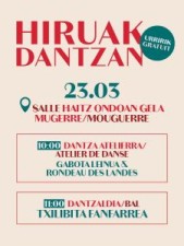 Avec le soutien des communes de Mouguerre, Saint-Pierre d’Irube, Villefranque et de plusieurs partenaires, Leinua initie « Hiruak Dantzan » (manifestation gratuite): 7 bals basques, 7 ateliers de danse, 1 bal trad’ et 1 spectacle sont au programme de cette première saison de « Hiruak Dantzan ».
