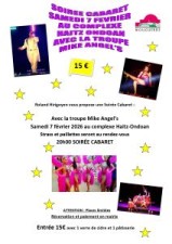 Roland Hirigoyen vous propose une Soirée Cabaret avec la troupe Mike Angel's le samedi 7 février 2026 au complexe Haitz-Ondoan, strass et paillettes seront au rendez-vous dès 20h00.